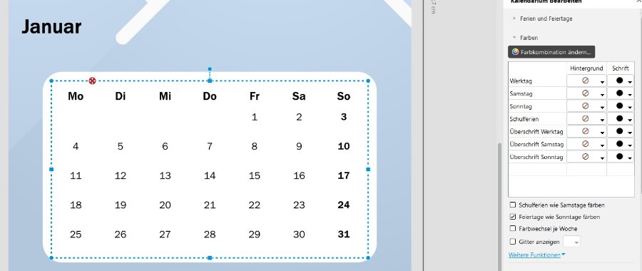 Dafür habe ich alle Hintergrundfarben des Kalendariums auf "keine Farbe" gesetzt, die Gitteranzeige deaktiviert und ein einfarbiges Foto dahinter gelegt. Wenn Du zweifarbig gestalten möchtest, kannst Du entsprechend 2 Fotos verwenden und ausrichten.