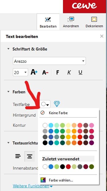 transparente erhabene Text kannst du herstellen, wenn du bei der Textfarbe "Keine Farbe" anklickst und dann die transparente Veredelung wählst (siehe Screenshot) Voraussetzung ist, dass es sich um eine von CEWE akzeptierte Schrift handelt. Sicherlich hast du eine gestalterische Vorstellung, warum die Schrift nur erhaben sein soll. Du solltest dir aber schon bewusst sein, dass die Lesbarkeit nur sehr eingeschränkt sein wird, d.h. man wird die Schrift eher fühlen als lesen können. Viel Spaß beim Ausprobieren. LG Traumfänger