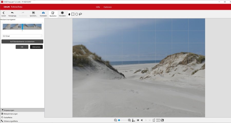 Versionsnummer: 7.2.2 Handelspartner: Cewe Beschreibung: Hallo, leider passiert es mit ziemlich oft, dass auf meinen Fotos der Horizont etwas schief ist. Das ist mit der CEWE-SW eigentlich gar kein Problem, der Horizont ist mit ein paar Maus-Klicks begradigt. Ich fände es allerdings gut, wenn man das Raster, an dem man sich orientieren kann, verschieben oder kleiner machen könnte. In meinem Beispiel würde ich gerne das Raster so verschieben, dass der Horizont genau auf einer weissen Linie liegt. Oder gibt es doch eine Möglichkeit? Viele Grüsse