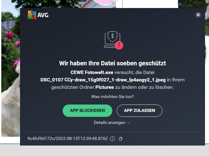 Anhand deines Screenshots können wir erkennen, dass es sich um eine Meldung deines Antivirenprogramms handelt. Dies scheint die CEWE FOTOWELT immer wieder zu blockieren, wenn sie auf den Bilderordner zugreifen möchte. Prüfe doch bitte einmal die Einstellungen deines Antivirenprogramms und passe die Zugriffsrechte für die CEWE FOTOWELT an. Gegebenenfalls ist hier auch eine Ausnahme für unserer Software nötig.