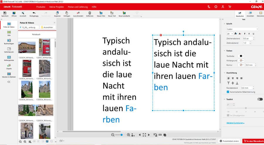 Das im Eingangsbeitrag beschriebene und hier nachgestellte Problem der Textlücken scheint behoben. Die Silbentrennung funktioniert allerdings noch immer nicht sauber. Interessant ist hierbei, dass die Silbentrennung in Abhängigkeit von der verwendeten Schriftart unterschiedlich reagiert. Ich habe die oben verwendeten Beispiele mit den Schriftarten Overlock und CEWE Head getestet, jeweils in 24pt. Beide Schriften möchten beim Verkleinern des Textfeldes das Wort "Farben" weiterhin gern falsch trennen: "Fa-rben". Die korrekte Möglichkeit "Far-ben" wird je nach Breite des Textfeldes zusätzlich angeboten. Mit "Flussschifffahrt" hat Overlock scheinbar kein Problem und trennt es an den richtigen Stellen. CEWE Head hingegen scheint das Wort weiterhin nicht zu kennen und trennt es noch immer wie hier gezeigt. Gibt es schon eine Aussicht darauf, mit welcher Version die Silbentrennung nach Rechtschreibregeln funktionieren wird? Liebe Grüße