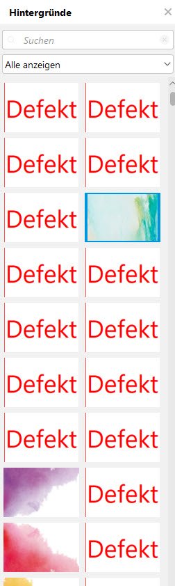 Ich bin mir ziemlich sicher, dass der defekte Hintergrund in die Kategorie der seinerzeit aus drucktechnischen Gründen wieder gelöschten Verläufs-Hintergründen gehört. Ich hatte das Problem auch mehrmals, allerdings wurde mir der Hintergrund nicht als defekt angezeigt sondern als nicht auffindbar!