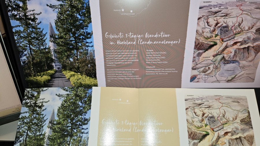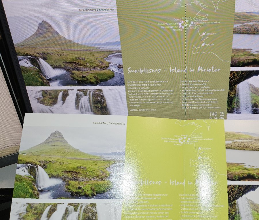 Ich kann gerne Fotos zur Illustration zustellen, vgl. unten. Vor einer allfälligen Neuaufgabe der Bestellung, wäre es wichtig, die Ursache für die falsche Farbdarstellung (vgl. oben a)) und die unschöne Darstellung der Islandkarte (vgl. oben b)) zu kennen. Damit ich dies entsprechend prüfen und gegebenenfalls anpassen kann. Betr. c) kann ich die Bilder noch mehr über den Seitenrand hinausziehen.