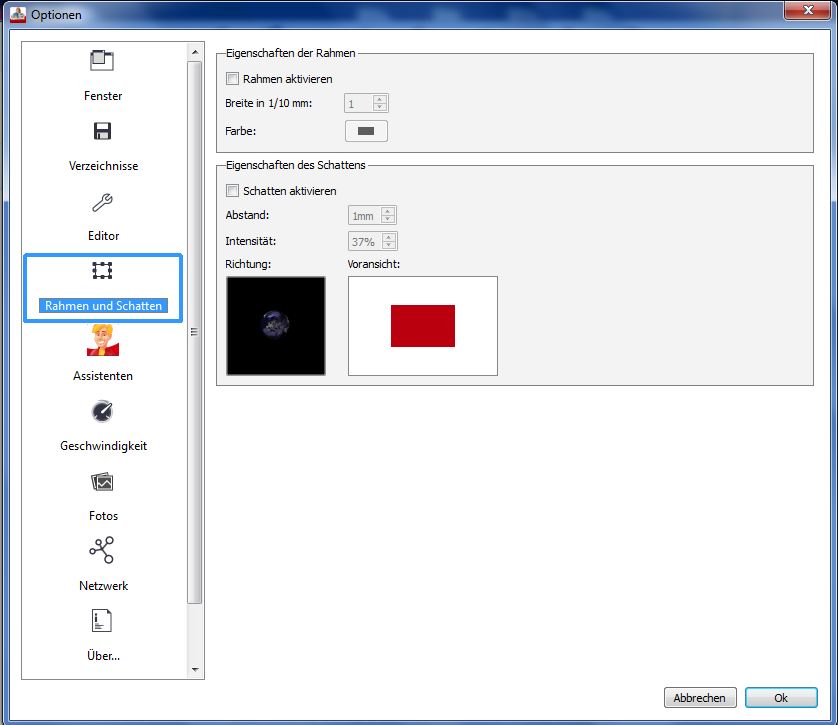 Versionsnummer: 4.8.3 Handelspartner: egal Beschreibung: Das Werkzeug "Schatten und Rahmen" läßt in der 4.8.3 zusätzlich auch ein Einstellung der Schattengröße zu. Bekannterweise kann man von dieser Tafel aus deren Einstellungen auch in die Grundeinstellungen übernehmen. Nur, in den Grundeinstellungen (Optionen -> Rahmen und Schatten) wurde die Schattengröße vergessen zu implementieren. Re: 4.8.3 - Schattengröße als Grundeinstellung?Es sieht so aus, dass die Schattengröße wirklich in die Grundeinstellungen übernommen wird. Dort aber kann ich sie weder kontrollieren noch verändern.
