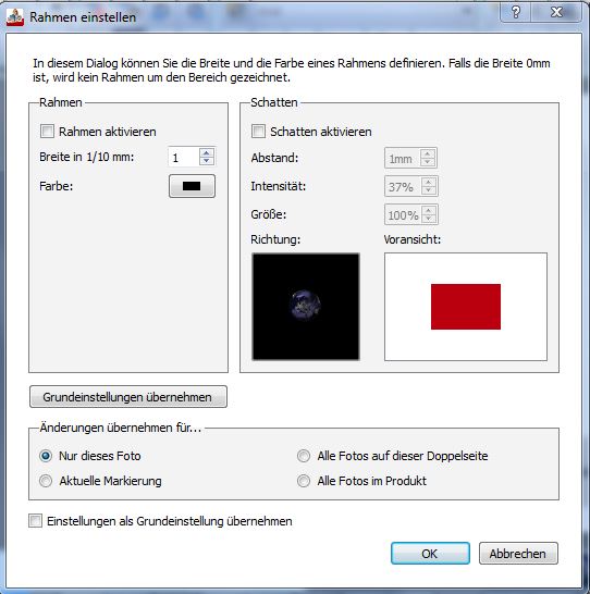 Ich aktiviere "Rahmen und Schatten" im nun erscheinenden Fenster setze ich bei Rahmen und/oder Schatten aktivieren ein Häkchen und stelle nun meine gewünschten Parameter ein. Nun auch bei Einstellungen als Grundeinstellung übernehmen ein Häkchen und schließe das Fenster mit ok. Wenn ich nun bei einem anderen Bild diesen Rahmen übernehmen will dann aktiviere ich wieder "Rahmen und Schatten" und aktiviere "Grundeinstellungen übernehmen". Diese werden mir nun angezeigt und ich kann sie auch verändern. Wo liegt also das Problem? Re: 4.8.3 - Schattengröße als Grundeinstellung?Das ist richtig, es ist kein großes Problem.