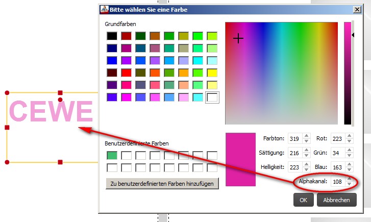 1. Im Farbtableau Alphawert einstellen, um Deckungsgrad der Farbe zu bestimmen (bei Textfeldern oder bei Texten)
