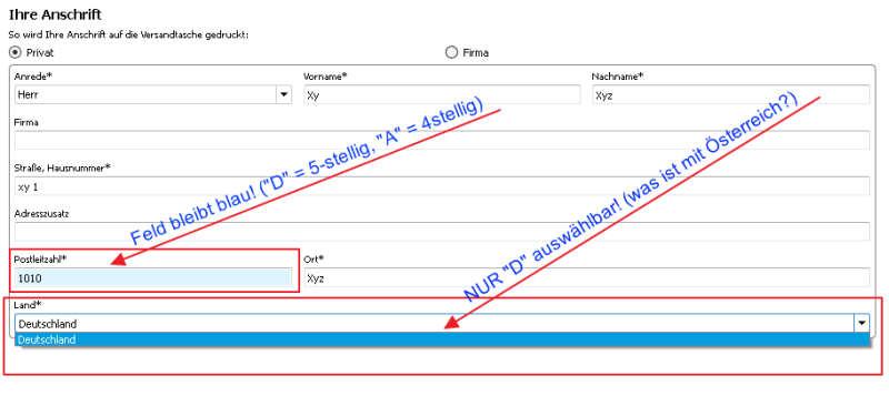 Beschreibung: Hallo zusammen, Nachdem ich von der Software zufälligerweise (im LibreOffice-Forum) gelesen hatte, installierte ich FOTOWELT 5.01 ungebrandet (ich bin kein Freund von Online-Bestellungen, außerdem kann man im Geschäft schon VOR Bezahlung eventuell reklamieren) auf AMDx6-3000MHz Win7/64 und probierte es aus - gefällt mir. Rasch ein (nur schnell gefülltes) Fotobuch zu Testzwecken erstellt und ab in den Warenkorb, um die CD-Erstellung mit einer RW zu testen. Hier liegt nun das Problem: Bei Eingabe meiner Anschrift bleibt die Postleitzahl farbig unterlegt (4-stellig für Österreich) und als Land ist NUR Deutschland vorhanden! Diese Anschrift soll aber auf die Versandtasche für die CD??? Das sieht mal super aus und sorgt sicher für Verwirrung: Max Mustermann Straße 0 1010 Wien Deutschland Im Anhang ein Bild mit nur Beispieldaten für die Anschrift. Danke im Voraus für die Hilfe Gerald Vorgehensweise: 1. neu installiert 2. Hilfe, Optionen und Forum durchsucht 3. ...