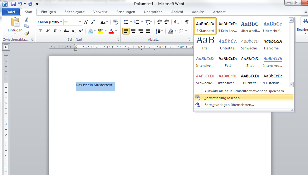 direkt in unserer Software ist es nicht möglich. Sie können aber in Word die Formatierungen verwerfen und den Text anschließend kopieren. Klicken Sie dazu einfach auf den kleinen Pfeil im Bereich Formatvorlagen und wählen Sie "Formatierung löschen" Sylke Re: Schrift einfügenDanke für die rasche Erklärung!