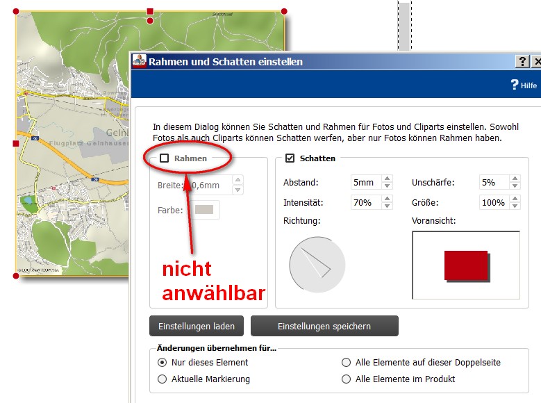 Im Unterschied zu den Vorversionen steht bei Markierung einer Landkarte nun (ab Version 5.0) auch die Rahmen/ Schatten-Funktion zur Verfügung.