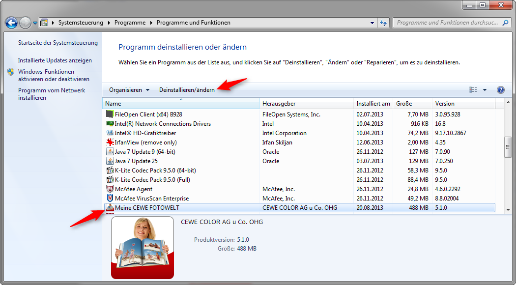 Sie kommen darauf zu einer Ansicht aller installierten Programme. Wählen Sie in dieser Ansicht, die Software aus und klicken in der Leister über den Programmen auf „Deinstallieren/ändern“.