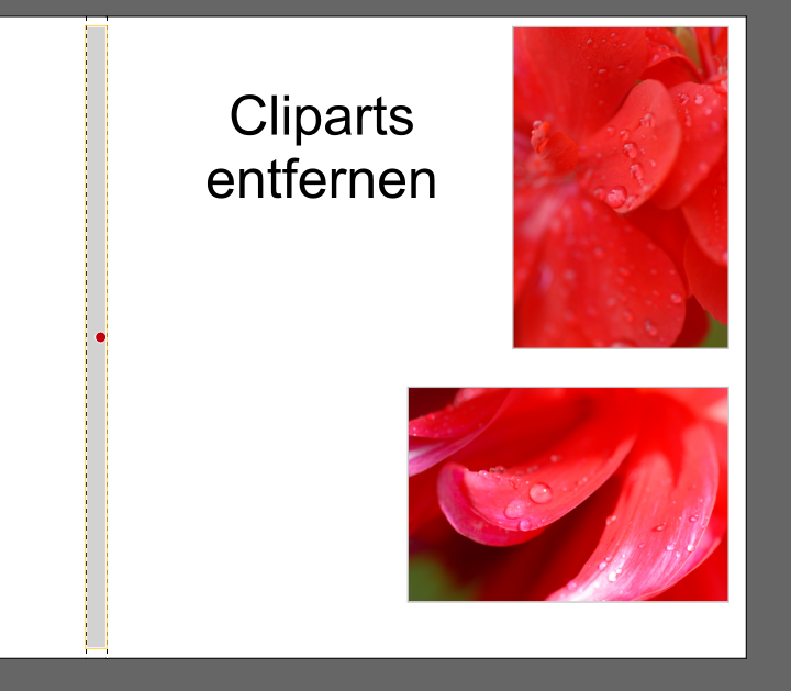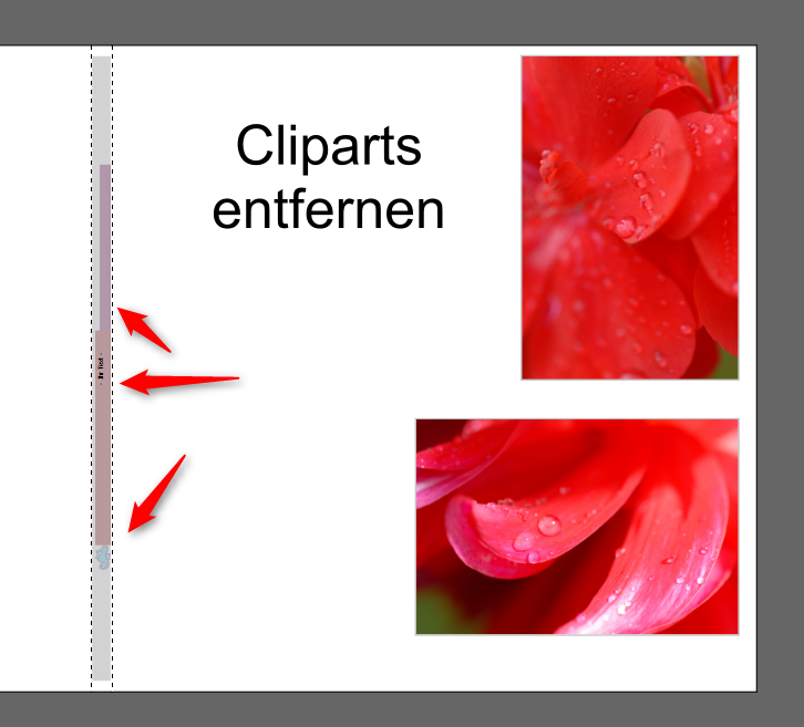 ein Eingriff in die mcf-Datei oder das Programmverzeichnis ist natürlich umständlich und sollte nicht notwendig sein. Tatsächlich konnte ich jedoch einen Weg finden, wie man diese unliebsamen Elemente, wenn nötig, vom Buchrücken entfernen kann. Ich habe folgenden Weg sowohl in der 5.1.1 wie auch in der 5.1.0 getestet. Dafür habe ich erst einmal einige Cliparts so auf dem Buchrücken platziert, dass Sie nicht mehr erreichbar sind: Nun drücken Sie die Entfernentaste. Dabei sollten Sie zu folgendem Ergebnis kommen: Ich hoffe jedoch, dass ich Ihnen damit vorerst einen Alternativweg bieten kann, bis wir Ihnen in einer zukünftigen Softwareversion eine einfachere Lösung bereitstellen können. Liebe Grüße