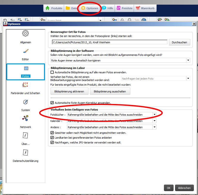 Unter "Optionen", wähle "Editor". Dann kannst du im Dialogbereich unter "weitere Hilfen" in der Zeile "Fotos und Cliparts automatisch positionieren..." die Option entsprechend umstellen. ABER: Auch wenn du die Bilderrahmen exakt an die Schnittkante legst, hast du das Risiko, dass im gedruckten Buch dann "Blitzer" am Bildrand erscheinen. Das ist produktionsbedingt. Meines wissens braucht jede Fotobuch-Produktion am Rand eine gewissse Schnitttoleranz. PROBIERE MAL: Das Bild als Hintergrund zu positionieren: Rechter Mousebutton, dann im Context-Menu den Pnkt "Als Hintergrund" wählen und weiter mit "Foto als Hintergrund auf beiden Seiten". Damit bleiben die Proportionen erhalten; du hast ausreichend Toleranz für die Schnittkanten; und es geht auch noch schneller als wenn du das Bild selber ziehen musst. Ich hoffe, das trifft deine Frage. Re: Grössenanpassung im Fotobuchja Mücke, das ists schon fast und ich kann damit leben, auch wenns noch nicht ganz optimal ist, aber mit ein wenig Eierei wirds dann schon und die Einband-Seite muss ich nochmals bearbeiten.