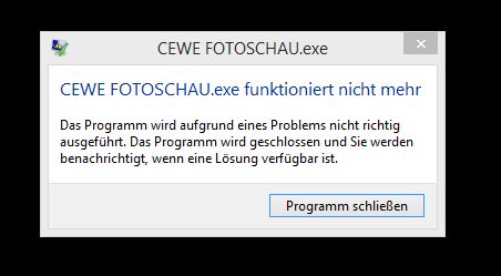 Das tut mir sehr leid! Sie verwenden aktuell die Version 5.1.5 und können nun seit dem Update die Fotoschau nicht mehr nutzen. Lässt sich die CEWE FOTOBUCH Software problemlos verwenden? Wie äußert sich Ihr Problem genau? Wann stürzt die Anwendung ab? Sie schreiben, dass Sie es mit einer Neuinstallation versucht haben. Wie sind Sie hier vorgegangen? Bitte schildern Sie mir das Problem etwas genauer. Gerne auch mit einem Screenshot zum besseren Verständnis. Sylke Re: CEWE Fotoschau.exe funktioniert nicht mehrOnlineFotoservice 5.1.5 (x64) funktioniert. Wenn ich dann aus dem Fotoverzeichnis ein Foto in der Fotoschau vergrößert darstellen will kommt die schon erwähnte Meldung: "CEWE Fotoschau.exe funktioniert nicht mehr". Wenn ich dieses Programm separat starte funktioniert es.