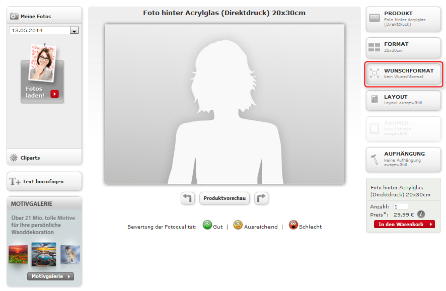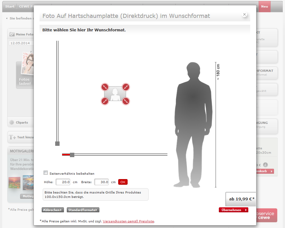 Sobald Sie mit Ihrem gewählten Format einverstanden sind, können Sie dieses mit „Übernehmen“ bestätigen. Anschließend können Sie wie gewohnt Ihr Bild auswählen, wenn gewünscht Texte und Cliparts einfügen und die Bestellung wie gewohnt abschließen.