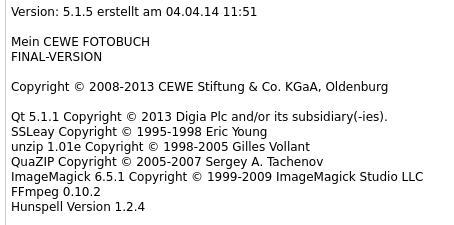Ich nin nun mit ausgehängte Platten (geht unter Linux und sicher ist sicher) ins Internet gegangen, habe dann die Cewe-Software gestartet. Das Fotobuch lag schon 3 mal im Warenkorb - trotz Abbruchmeldungen. Nun konnte ich den Handelspartner auswählen und auch die Art der Übermittlung (bei mir also CD). Ebenso wurden Preise etc. aktualisiert. Anschließend Software beendet und wieder raus aus dem Internet. Ich habe dann nochmal den Warenkorb gelehrt, das Fotobuch neu in den Warenkorb gelegt und konnte dann offline die CD problemlos brennen. Man muß also nach der Installation einmal die Software online öffnen. Tut man dies nicht hat man meine Probleme. Ja, und ich habe alle Fotoprodukte zur Auswahl. Anbei die Versionsinfos. Re: Fotobuch auf CD ohne InternetDa hatte ja nur ein Klick zum Erfolg geführt! |