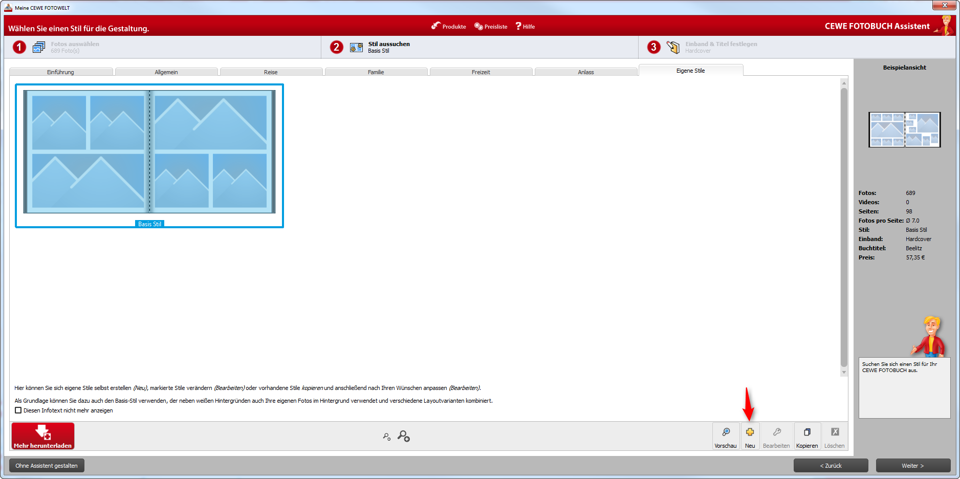Das Thema mit dem Scrollbutton habe ich mir heute nocheinmal genauer angesehen. Auch bei mir verhält dieser sich sehr schwerfällig. Ich werde es bei meinen Kollegen aus der Entwikclung ansprechen. Immerhin möchte ein Kunde, der mit dem Assitenten arbeitet, Zeit sparen. Reagiert dieser jedoch langsam, kann ich den daraus entstehenden Ärgern durchaus nachvollziehen. Ich habe außerdem noch einmal genauer in unseren Fotobuch Assistenten der Version 6.0.1 geworfen und entdeckt, dass Sie sogar eigene Stile entwerfen können. Sollten Sie bestimmte Gestaltungsgrundlagen immer wieder verwenden, könnte dies vielleicht interessant für Sie sein. Liebe Grüße