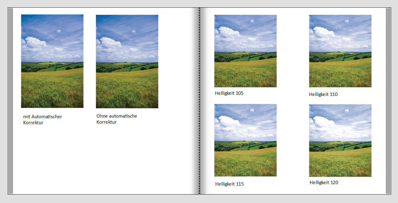 Ich kann Ihren Wunsch nach Einzeldrucken für Farbvergleiche nachvollziehen. Sollten Sie dies jedoch zu jedem Projekt planen, erscheint mir der zusätzliche Aufwand sehr groß. Möglicherweise würde es genügen, wenn Sie einige möglichst unterschiedliche Fotos heraussuchen und aus diesen ein Muster erstellen. Gerne können Sie hierfür auch mal die Automatische Bildkorrektur mal anschalten und ein anderes mal abschalten. Oder auch ein Bild mit unterschiedlichen Helligkeitswerten einfügen. Zum Beispiel: Sie haben ein Bild von einer Wiese mit einem blauen Himmel. Dieses Bild fügen Sie einmal mit automatischer Korrektur ein und einmal ohne. Zusätzlich bearbeiten Sie das Bild in der Fotoschau und schreiben dazu, wie stark Sie die Helligkeit erhöht haben (falls Sie befürchten das Bild könnte zu dunkel erscheinen). Dies könnte dann so aussehen. Generell ist uns jedoch bewusst, dass nur eine Minderheit unserer Kunden ein kalibrierter Monitor zur Verfügung steht, weshalb Sie sich mit einer Reklamation auf Grund von Farbungenauigkeiten auch immer gerne an meine Kollegen aus dem Kundendienst wenden können. Meine Kollegen werden dann gerne nach eine passenden Lösung für Sie suchen, damit Sie mit Ihrem Druckergebnis zufrieden sind. Liebe Grüße