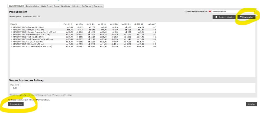 bei Fotoheften scheint es direkt bei CEWe keinen Rabatt zu geben. Aber auch bei Fotobüchern gibt es bei 10 Exemplaren gerade mal 5% Nachlass: https://www.cewe.de/service/preisliste- ... obuch.html Möglicherweise lohnt es sich, mal die Preislisten der CEWE-Handelspartner zu vergleichen. Bei Budni gibt es zum Beispiel auch Rabatt auf Fotohefte (Softcover). Re: Mengenrabatt ?Das ist grundsätzlich abhängig von Deinem Handelspartner. Prüfen kannst Du das in der Software, indem Du oben auf Preisliste --> Preis und Lieferzeiten gehst. Dort kannst Du dann die Rabattmöglichkeiten über Preisstaffeln anzeigen bzw. über Preiskalkulator mit genauer Seitenzahl ausrechnen lassen. So sieht das z.B. bei dm aus: