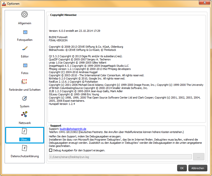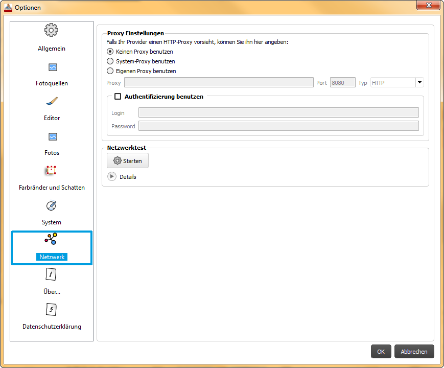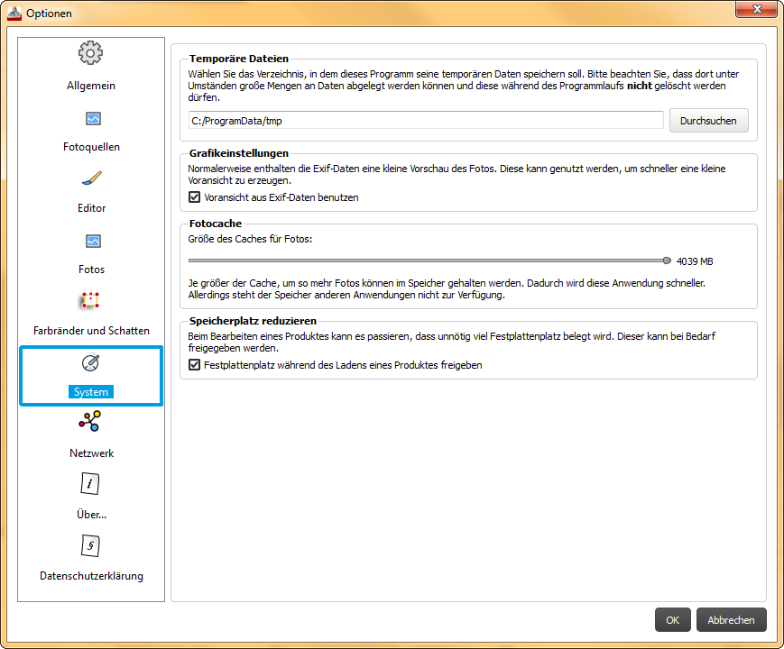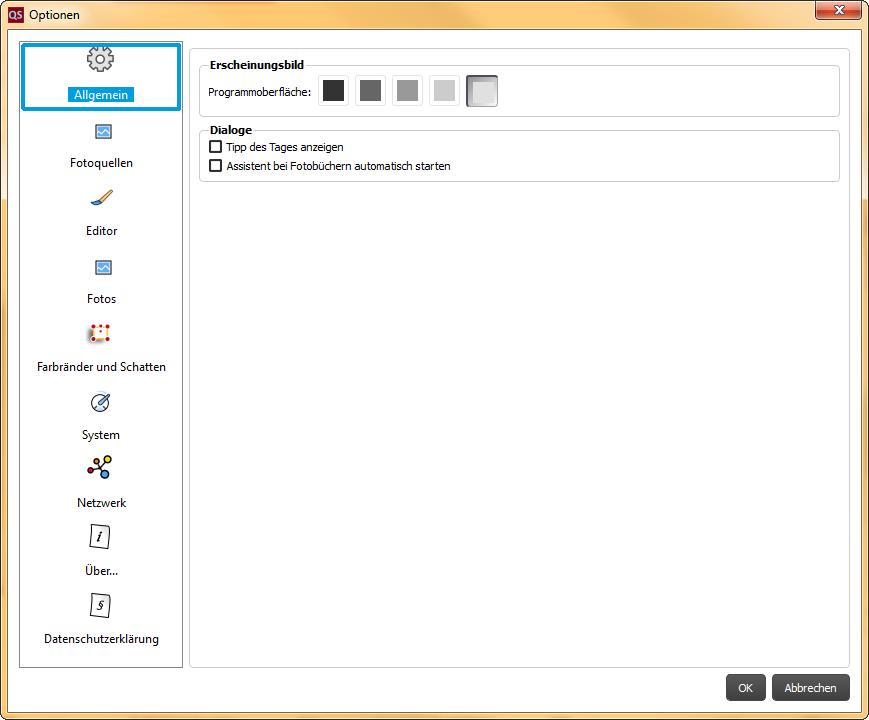 In den Optionen finden Sie einige Einstellungsmöglichkeiten, die Ihnen die Arbeit mit der Software erleichtern können. Sobald Sie auf den Punkt "Optionen" klicken, öffnet sich ein neues Fenster, dass in unterschiedliche Kategorien aufgeteilt ist, die Sie in der linken Spalte finden. Automatisch starten die Optionen mit der Kategorie "Allgemein". Zudem können Sie an- und abwählen, ob der Tipp des Tages bei Programmstart angezeigt wird, wie auch das automatische Öffnen des Fotobuchassistenten, beim Starten eines neuen Projektes. Eine Kategorie weiter unter "Fotoquellen" können Sie bestimmen mit welcher Bilderordner bei Programmstart links zur Verfügung stehen soll, wie auch weiter Bildquelle, wie Facebook oder Picasa. Wenn Sie noch speziellere Anforderrungen an die Arbeit mit Ihren Bildern haben, dann können Sie in der Kategorie "Fotos" weitere Einstellungen vornehmen, wie das Abschalten der automatischen Bildkorrektur. Alle Infos rund um die Datenschutzrichtlinien können Sie hier im Bereich "Datenschutzerklärung" nachlesen. Zudem finden Sie hier auch eine Kontacktmöglichkeit, falls Sie weiter Fragen speziell zu diesem Thema haben. Liebe Grüße