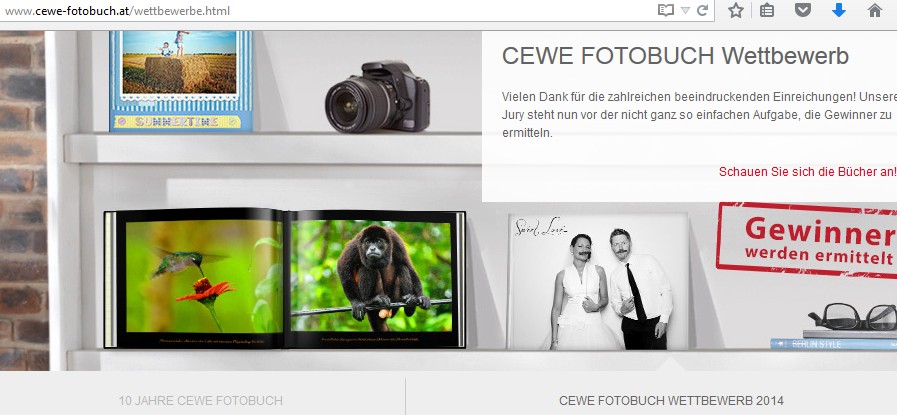 Re: FotobuchwettbewerbHier ist ein Link, der auch auf die Gewinner des Öst. CFB-Wettbewerbs verweist: http://www.cewe-fotobuch.at/wettbewerbe.html. Allerdings ist der Link kaum zu finden.