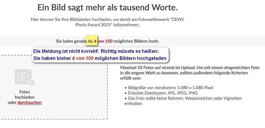 Dieses Phänomen ist mir auch schon aufgefallen, habe ich einfach ignoriert. Zur Überbrückung deshalb eine Anmerkung zum individuellen Bildzähler. Meines Erachtens müsste zum angezeigt werden, wieviel Bilder bereits hochgeladen wurden. Ansonsten ist die Anzeige nämlich irreführend bzw. nicht korrekt. 2024-06-18_133739_Award_Bildzähler.jpg