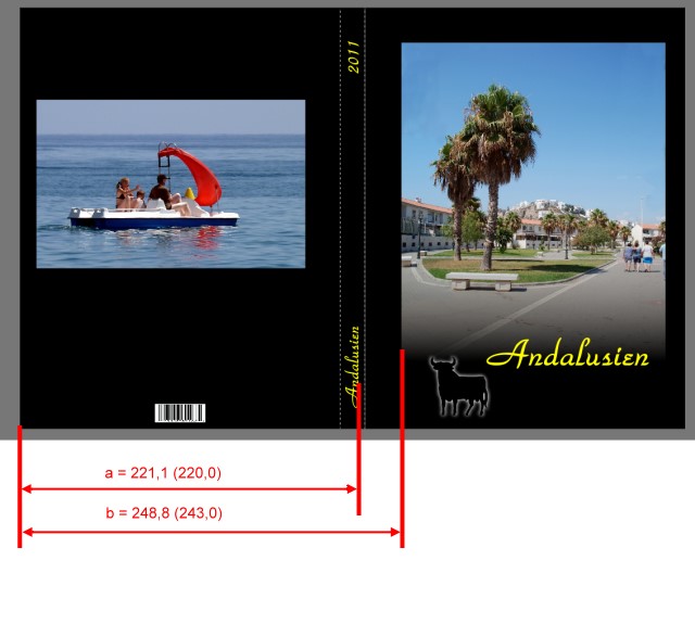 1. Nach Ihrer Aussage erfolgte irgendwann in diesem Jahr eine Umstellung in der Produktion, ca. 4 Monate her, die der Auslöser sein soll. Inklusive meinem Buch haben auch andere bestätigt, dass die Verschiebung in Büchern auftrat, die fast ein Jahr alt sind. Daher ist ein Zusammenhang schon mal unmöglich. 2. Zwar kann ich Ihre aktuellen Kommentare nicht ganz sicher interpretieren. Wenn sich stets nur die Vorderseite verschiebt , kann das doch nur heißen, dass die Bücher nun plötzlich sehr viel dicker sind als früher. Das mag sein, aber ich kann mir beim besten Willen nicht vorstellen, dass die gedruckten Bücher plötzlich 40 % dicker sein sollen, denn so groß ist bei mir die Abweichung in etwa. Außerdem dürfte dann auch die Schrift auf dem Buchrücken nicht mehr mittig sein, ist sie aber! Bis an diese Stelle gibt es noch keine Abweichungen. Nun überprüfe ich so was ja gerne exakt nach. Wie also sind die Maße im Layoutentwurf und am fertigen Buch? 1. Buchrückenbreite: Im Layout ca. 16,3 mm, am fertigen Buch etwa 15,3 mm - also sogar weniger als geplant! Aber man muß natürlich auch beachten, dass die Kanten gerundet sind und vielleicht diesen Millimeter schlucken. 2. Buchdeckelbreite: Im Layout ca. 209 mm, am fertigen Buch etwa 207 mm. Hier geht je noch ein bißchen durch den Prägefalz verloren, auch die Rundungen um den Buchrücken herum schlucken etwas Breite. Weitere Messungen: Ich messe den Abstand der Unterkante der Buchrückenschrift zum linken Rand: Im Layout 221,1 mm, am fertigen Buch 220,0 mm, also wiederum sehr exakt. Der eine Millimeter mag der Fertigungstoleranz geschuldet sein. Nun messe ich den gleichen Abstand zum Bild vorn, das nicht sehr weit entfernt liegt: Im Layout sind es 248,8 mm, am fertigen Buch aber nur 243,0 mm! D.h. auf diesen gerade mal 2 cm Raum zwischen Schrift und Bild gehen rund 6 mm verloren!!!! Die Erklärung muß woanders liegen und da helfen auch keine veränderten Schnittzugaben weiter. Mir scheint, sie ist bis heute noch gar nicht wirklich gesucht und gefunden worden. Ich bin noch immer der Aufffassung, dass wir von 2 verschiedenen Problemen reden und Sie momentan auf einer ganz anderen Baustelle baggern. Ich bitte die Mitarbeiter von CEWE darum, angesichts Ihres scheinbar gelösten Problems nicht den Blick darauf zu verlieren, dass es noch andere Ursachen geben könnte. Re: Foto auf dem Cover/Rückseite positionierenZur besseren Vorstellung hier nochmal die grafische Darstellung des o.g.: