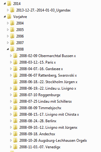 Mit RAW fotografiere ich sehr wenig, da ich dann im Fotobuch keinen Unterschied erkennen kann. Photoshop CC bietet einen Kamera-Raw-Filter an, den man an jpg's verwenden kann, ist sehr zu empfehlen. Für das umbenennen meiner Dateien verwende ich Adobe Bridge, auch für die Eingabe des IPTC-Felds "keywords". Dazu verwende ich auch vorgefertigte Stichwörter wie: Urlaub, Amerika, Indien,...Familie, Geburtstag, Hochzeit,....Diese Vorgaben sind dann sichtbar und ich brauche sie nur anklicken, statt auszuschreiben. Falls mir einmal extrem langweilig ist, werde ich dies für alle Fotos noch nachholen. --------------------------------------------------- Re: Plauderecke - Bilderablage organisierenAuch meine Ordner-Struktur sieht so aus wie bei Silber-Distel. Mißlungene Fotos lösche ich, manche - vor allem solche, die in ein Fotobuch sollen - bearbeite ich. Von Zeit zu Zeit speichere ich alles auf einer externen Festplatte ab. Bewertungen, Keywords, Geo-Angaben sind für mich nicht so interessant, da ich meine Ordner und Unterordner entsprechend genau benenne. Außerdem mache ich mir viel Notizen zu Reisen usw., so daß es kein Problem ist, Fotos zuzuordnen oder zu finden. Mit den RAW-Formaten geht es mir wie Rotuma, ich erkenne im fertigen Buch keinen Unterschied. In letzter Zeit habe ich damit begonnen, alte Negative und Dias zu digitalisieren - Wahnsinnsarbeit - wahrscheinlich habe ich die nächsten 10 Jahre damit voll zu tun. Die Ordnerstruktur für diese Bilder ist genauso wie bei den digital fotografierten Bildern. Da ich früher schon immer alles schön notiert habe, fällt es mir auch nicht schwer, diese Bilder richtig in eine zeitliche Abfolge zu bringen. Auf CD oder DVD speichere ich nur Fotos, die ich als DIA-Show Freunden zeigen möchte. So hat jeder seine Vorlieben je nach Verwendungszweck. Mein relativ simples Verfahren ermöglicht es mir jedenfalls, meine bisher ca. 30.000 Fotos zu verwalten.