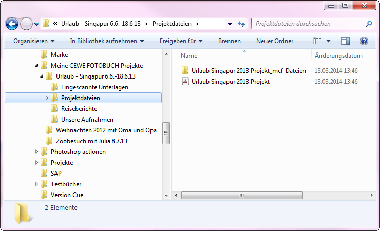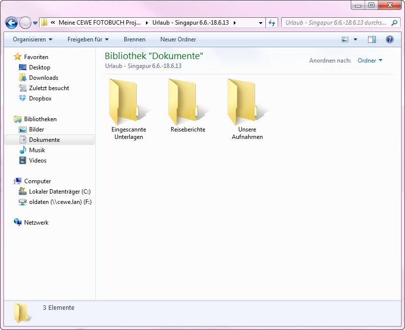 1. Richten Sie einen Ordner in Ihrem persönlichen Bereich wie „Eigene Dokumente“ oder „Eigene Bilder“ ein, dem Sie einen themenübergreifenden Namen geben, wie z.B. Meine CEWE FOTOBUCH Projekte.