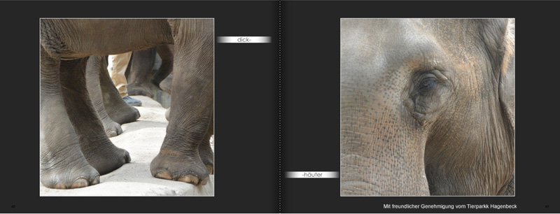 In einer übermütigen Stunde dachte ich, warum immer nur rechteckige Fotos und nicht auch einmal etwas schiefes, und habe einige Fotos schräg beschnitten. Abgesehen davon, dass es recht aufwändig ist, bin ich vom Ergebnis nicht sooo überzeugt. Die schrägen Balken, die über den Falz gehen, sind bei nicht lay-flat Bindung jedenfalls ungeeignet, weil der Falz einen Teil des Balkens abdeckt und dadurch der Eindruck einer Stufe im Balken entsteht.