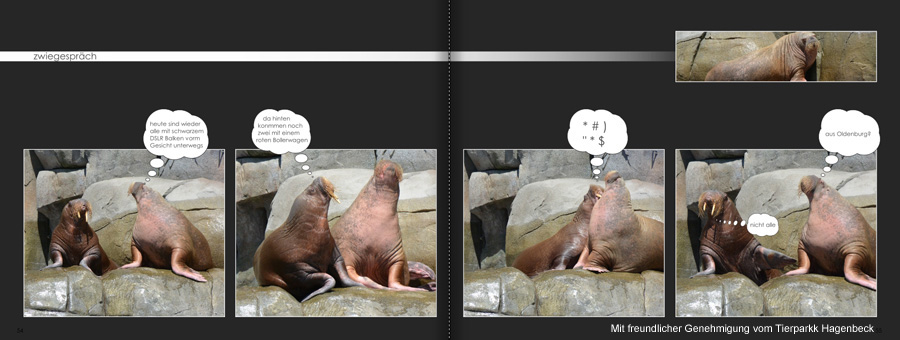 Halle Grasmücke, deine Beispiele sind sehr schön. Die schrägen Fotos sind interessant, gerade auch in Verbindung mit dem schrägen Text. Auch die Sprechblasen sind ne nette Auflockerung. Tolle Ideen, danke fürs Teilen.