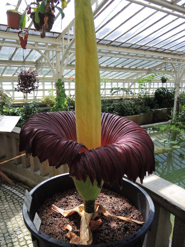 In der Nacht ist die Titanenwurz aufgeblüht. Sie gilt als größte Blüte der Welt und blüht nur zwei Tage. Deshalb hat der Botanische Garten München heute und morgen bis 24.00 Uhr geöffnet. Am ersten Tag blühen die weiblichen Blüten auf (heute an Fronleichnam), am zweiten die männlichen. Der Botanische Garten hat rund 20 Jahre (!) gebraucht, um diese Pflanze zur Blüte zu bringen. Die Blüte hat einen Durchmesser von etwa einem Meter, der Pflanzenkolben in der Mitte ist 1,75 Meter hoch. Die Blüte ist mit starkem Aasgeruch verbunden, wer aber die Toiletten auf der Wiesn übersteht, braucht hier keine Befürchtung zu haben. Der Gestank hält sich meiner Meinung nach in Grenzen. Also wer Lust hat, hat bis morgen Nacht noch eine Chance! Re: Challenge 05/2016 • Teil des GanzenAuch eine Teilansicht der Titanenwurz. Dieses Schauspiel wollte ich mir nicht entgehen lassen.
