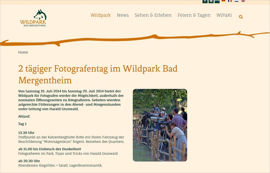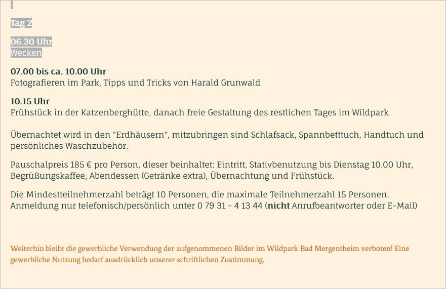 Es ist aber ratsam bei einer Fütterungsführung teilzunehmen, da nicht alle Tiere den ganzen Tag über aktiv zu sehen sind. Sie haben unter Wildpark - Fotografen eine Sonderführung, das gibt es noch nicht lange. http://www.wildtierpark.de/ Re: Gewinnspiel: Das ist ein Gedicht[/quote]Ich habe Hagenbeck auch mal angeschrieben. Mal sehen, was sie antworten :-) Allein auf Flickr gibt es unzählige Motive "ohne" die gewünschte Kennzeichnung der Bilder. Die meisten "normalen" Parkbesucher wissen meistens gar nicht, dass eine Veröffentlichung an bestimmte Voraussetzungen geknüpft ist. Aber als Gruppe fällt man natürlich mehr auf.[/quote]