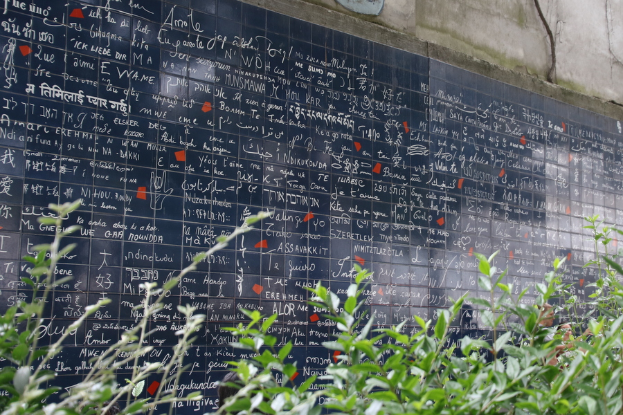 Der Schriftzug „Ich liebe Dich“ ist hier auf blauen Kacheln in über 300 Varianten und 250 Sprachen der Welt aufgetragen.