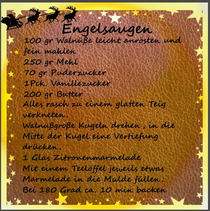 unsere Lieblingsplätzchen sind Walnussplätzchen. Auch von mir gibt es das Rezept, ich hoffe das ich alles richtig gemacht habe walnussplätzchen.JPG LG Netti59 [/quote] So, ich habe nun 2 Einzelscreenshots gemacht. Ist das okay? Re: Adventsspecial: Zweite Advents-ChallengeSchönen Advent, gutes gelingen und liebe Grüße Anika