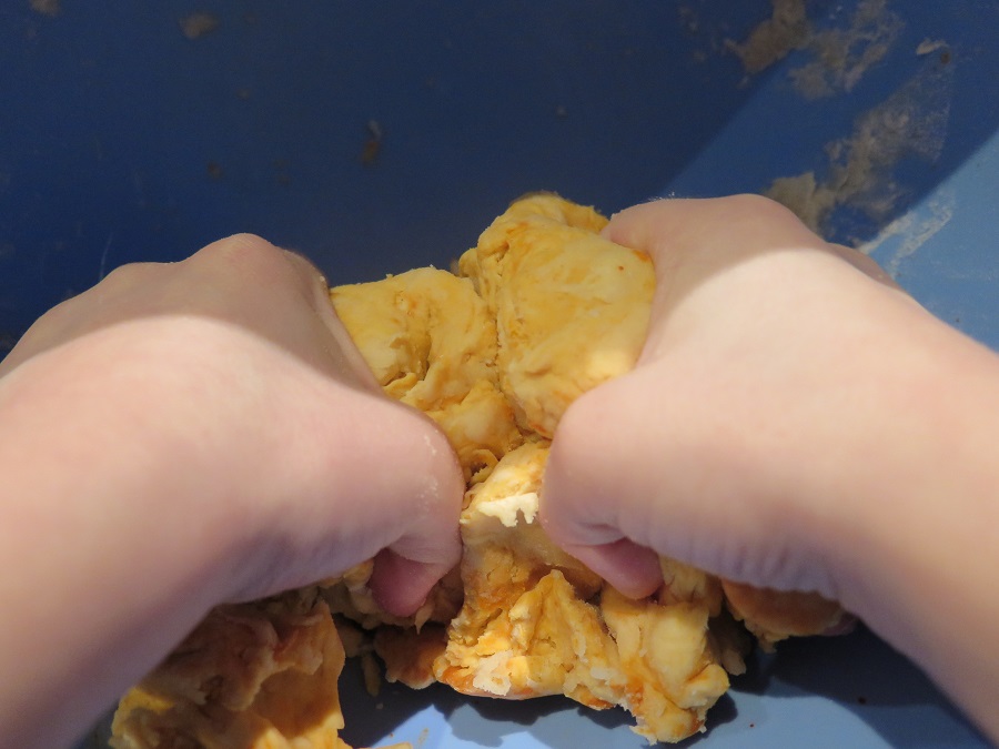2 Tassen Mehl, 1/4 Tasse Salz, 1/2 Tasse Wasser, 1 EL Speiseöl, Ostereierfarbe, vermische und verknete alles gut, und schon ist die Kinderknete aus eigener Herstellung fertig! Mit ein bisschen Übung lässt sich daraus sogar ein Sonntagsfrühstück für Mama und Papa zaubern... Liebe Grüße