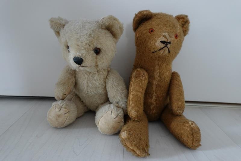 Der helle heißt "Berliner", weil ihn mir meine Großeltern mal aus Berlin mitgebracht haben, es war mein allererster Teddy und hat sich für seine ca. 49 Jahre ganz gut gehalten, er hat ein robustes Fell... "Fritzi", der Braunbär, ist etwas ramponiert, mit ihm haben zunächst die Nachbarskinder gespielt, dann mein Bruder und letztendlich erbte ich ihn. Fritzi ist mind. 60 Jahre alt und hat es ziemlich in den Schultergelenken... Nun sind die beiden gemeinsam im "Heim für alte Bären" und dürfen ihre alten Tage auf meiner Couch verbringen..