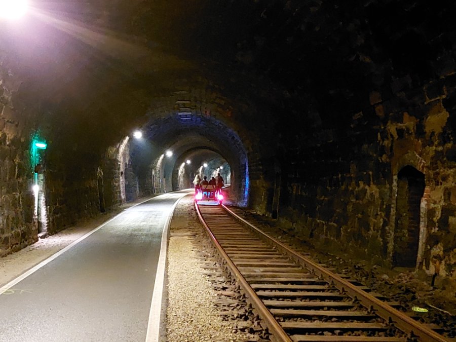 Eine Draisine ist im kilometerlangen Tunnel der stillgelegten Kanonenbahn im Eichsfeld unterwegs.
