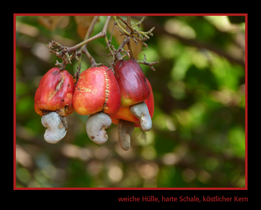 Re: Challenge 04/2016 • Harte Schale, weicher KernDie Natur bringt fantastische Erzeugnisse zustande: Anacardium occidentale, Cashewbaum. Die Cashew-Nuss hängt als unscheinbare Niere unter einem fleischigen Fruchtstiel - der weichen Scheinfrucht, die z.B. zu Marmelade oder Saft verarbeitet wird. Da diese Frucht leicht verderblich ist, wird sie nur lokal am Herkunftsort verarbeitet. Die Nuss dagegen ist überall zu haben.