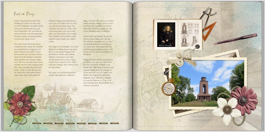 Die gezeigten Seiten sind als Kapiteleröffnung gedacht. Auf der ersten Seite ist eine kurze Tagebuchbeschreibung auf der zweiten Info zum Ziel usw. Liebe Grüße Asiafan