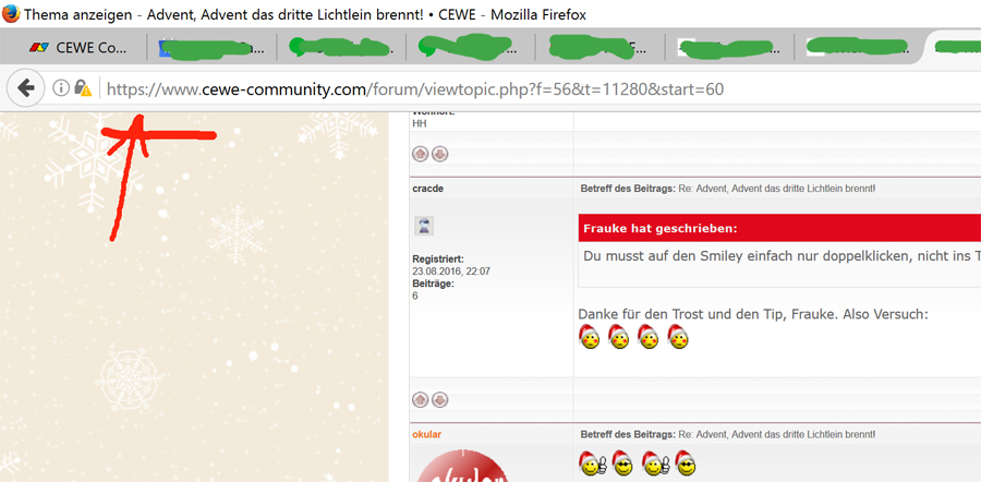 --------------------------------------------------- Re: Advent, Advent das dritte Lichtlein brennt!grasmuecke hat geschrieben: Und erst, wenn ich aus dem https ein http machen, kann ich smileys verwenden und die eckigen-Klammer-Codierungen.