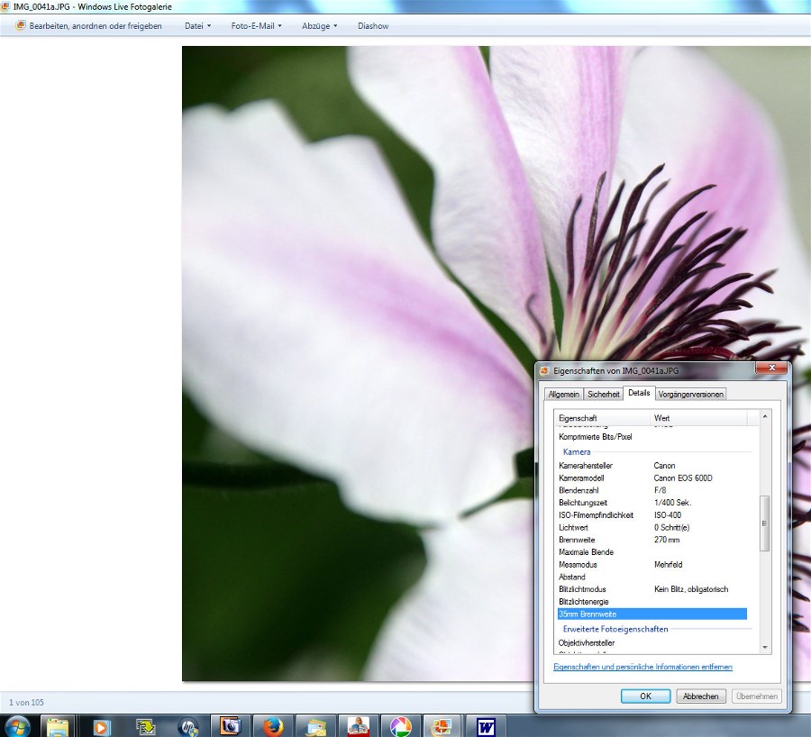 ich weiß ja nicht, welches betriebssystem du verwendest, aaaber: falls es win7 ist und du im explorer(dateimanager bei vista) ein foto anclickst und dann mit der rechten maustaste auf eigenschaften clickst, gibt es dort die möglichkeit 'details' und da nur etwas runterscrollen, dann siehst du schon alle infos *einfachster weg* liebes grüßle lou - geändert: nachtrag *und okular war schneller..... ;-)* Re: Challenge 12/2013 • Das ABC-KarussellNachtrag zu den EXIF-Daten: