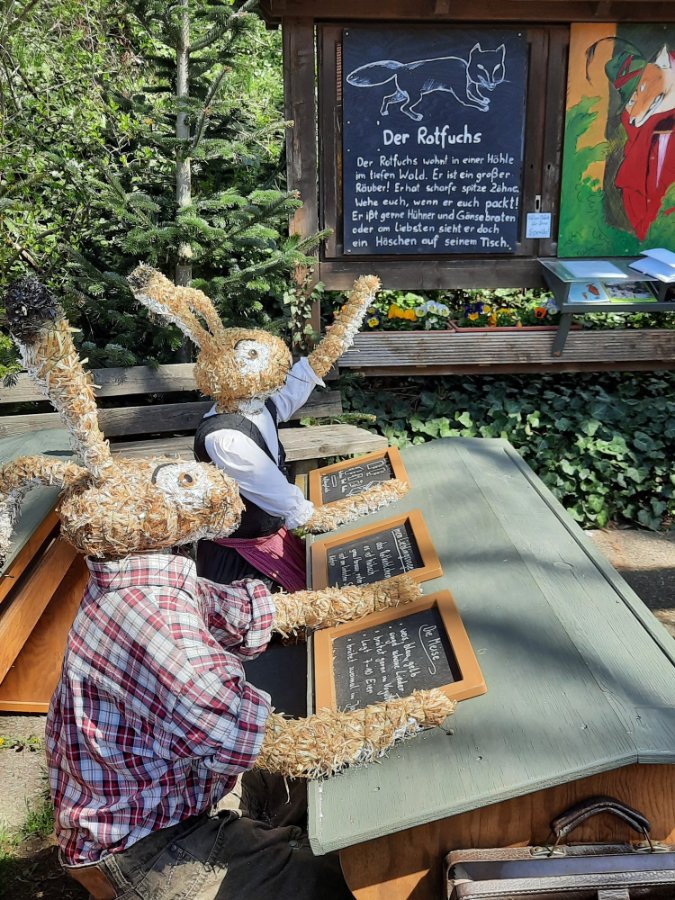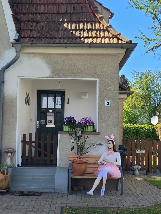 Re: Die Frühlings-Foto-Challenge 2025Hierzulande gibt es sogar ein eigenes Osterhasendorf: Ganz Fischbach ist zur Osterzeit mit bemalten Holzhasen dekoriert. Meistens werden dabei Szenen aus dem Dorfleben z. B. Taufen, Hochzeiten, Probe des Gesangsvereins, Schulunterricht etc. dargestellt. Hier als Beispiel die Dekoration vor dem Haus des Kinderarztes.