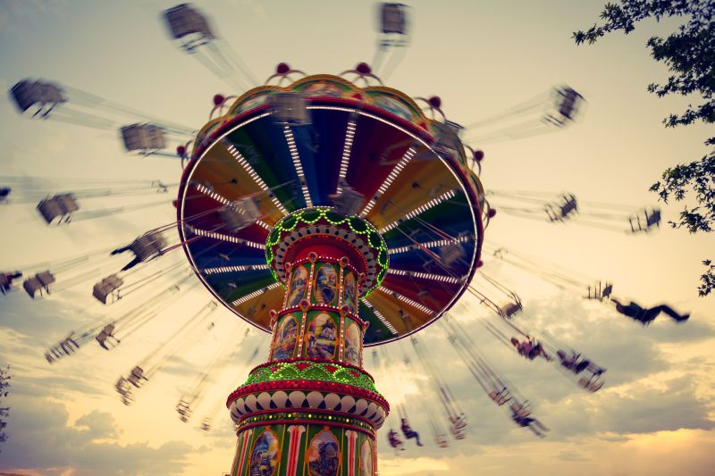 Jahrmärkte und Vergnügungsparks sorgen für actionreiche Bilder und reinste Farbexplosionen. Schwindelerregende Achterbahnkurven, Karusselle im waagerechten Flug, Spiegelkabinett und Geisterbahn. Grelle Farben bei Tag und Nacht.