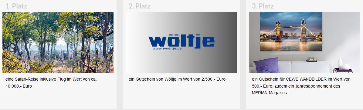 Als Hauptgewinn lockt eine Safari-Reise im Wert von 10.000 Euro sowie ein einjähriges Jahresabonnement des MERIAN-Magazins. Der zweite Preis ist ein Gutschein von Wöltje im Wert von 2500,- Euro und ein einjähriges Jahresabonnement des MERIAN-Magazins. Als dritten Preis vergeben wir ein Gutschein für CEWE WANDBILDER im Wert von 500,- Euro sowie ein Jahresabonnement des MERIAN-Magazins.