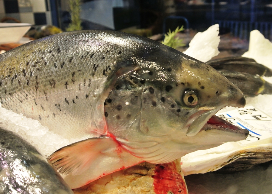 Dieser Fisch schaute aus einem Schaufenster auf dem Viktualienmarkt in ganzer Frische.