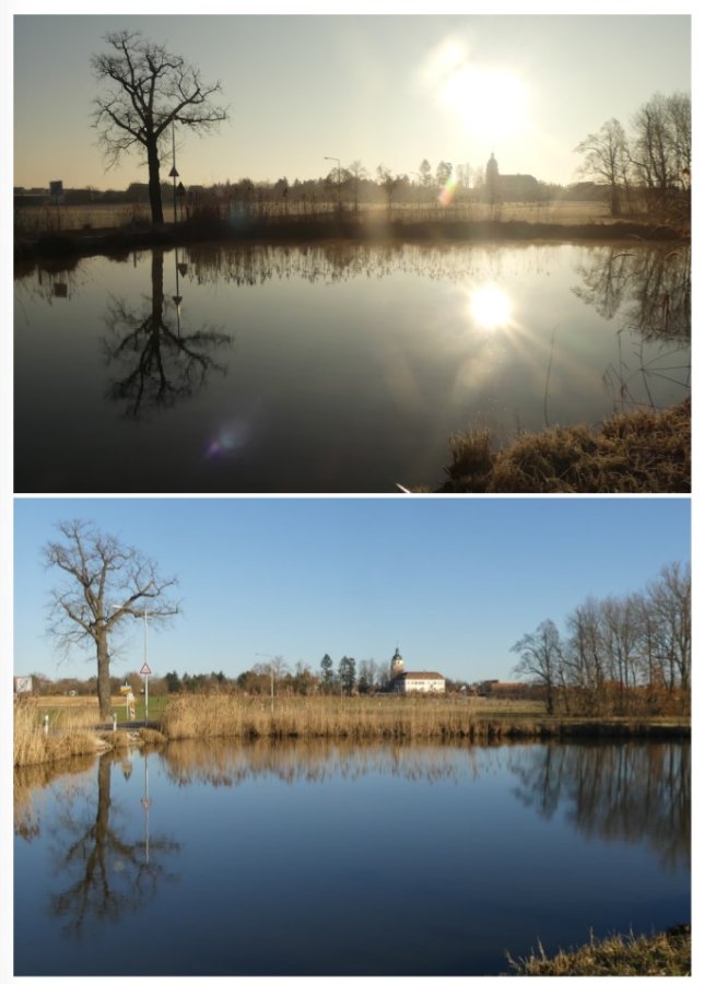 Das Gründlacher Schloss und die Kirche von Kleingründlach aus, früh im Gegenlicht und am späten Nachmittag.