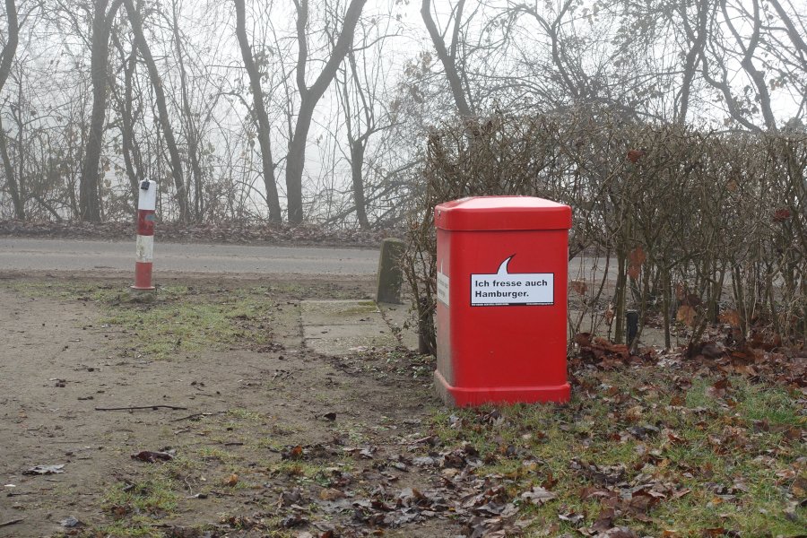 Ich bin immer wieder begeistert von den preisgekrönten roten Hamburger Mülleimern mit den lustigen Sprechblasen. Es gibt davon mehrere, an denen ich täglich vorbeikomme, gestern am Spätnachmittag und heute am frühen Morgen z.B. an diesem.