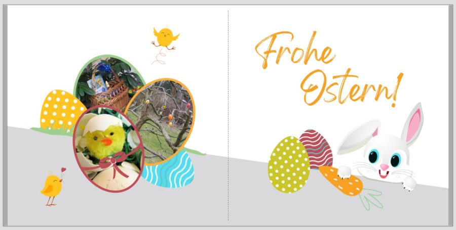bei mir in Ostereierstedt in Sachsen-AmWald ist eigentlich immer Ostern, denn ich suche einfach immer irgendetwas! Heute suche ich eine brillante Idee für ein schönes Oster-Design mit ovalen, eierförmigen Bildern. Haben Sie eine Idee? Sehr gut, denn das ist Ihre heutige Aufgabe. Entwerfen Sie ein Oster-Design für eine Doppelseite. Die Art und Weise bleibt Ihrer Kreativität überlassen.