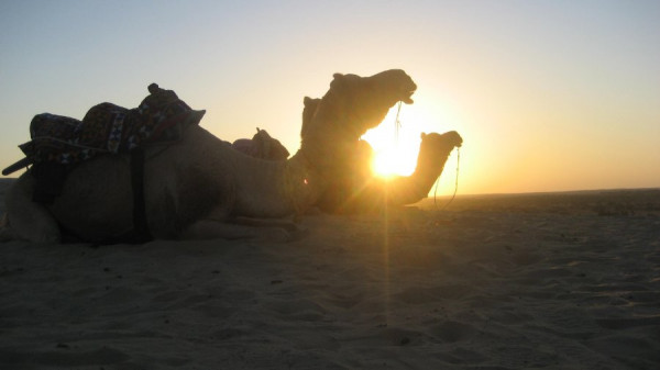 Sonnenaufgang in der Wüste Thar in Indien. Die Sonnenstrahlen zwischen den Köpfen der Kamele