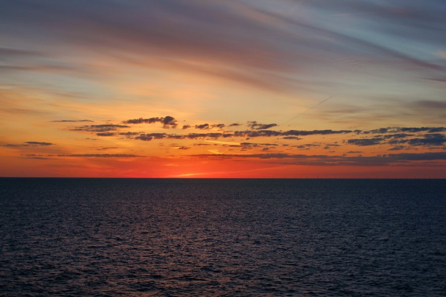 Sonnenuntergang im Skagerrak. Ungewöhnlich für die Gegend: Man konnte um 22 Uhr noch kurzärmelig auf dem Sonnendeck sitzen und den Sonnenuntergang geniessen. Nachteil war allerdings, dass der Sonnenuntergang gewissermassen eine Ankündigung für das Wetter am nächsten Tag in Oslo war - Regen ohne Ende D:frown: .